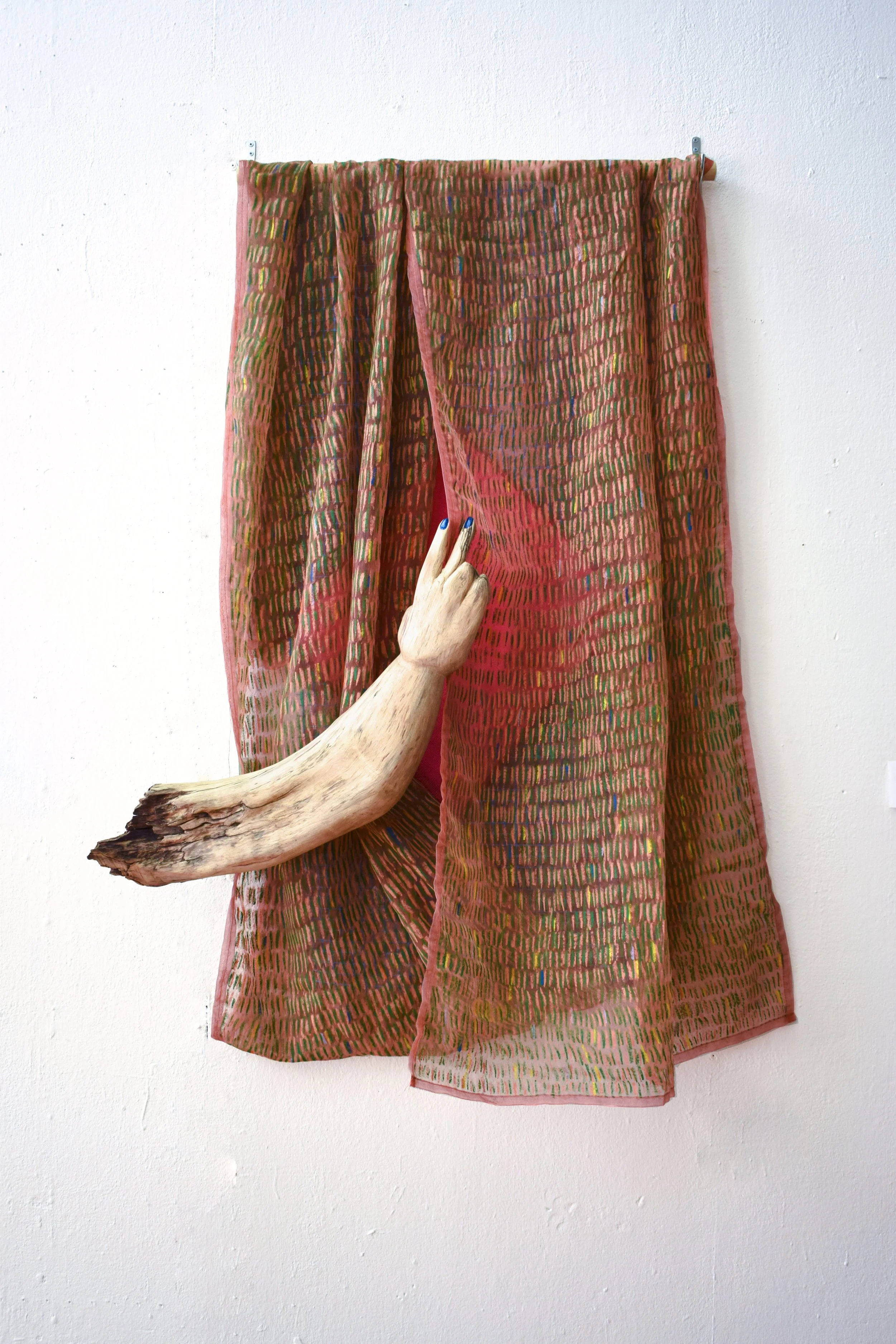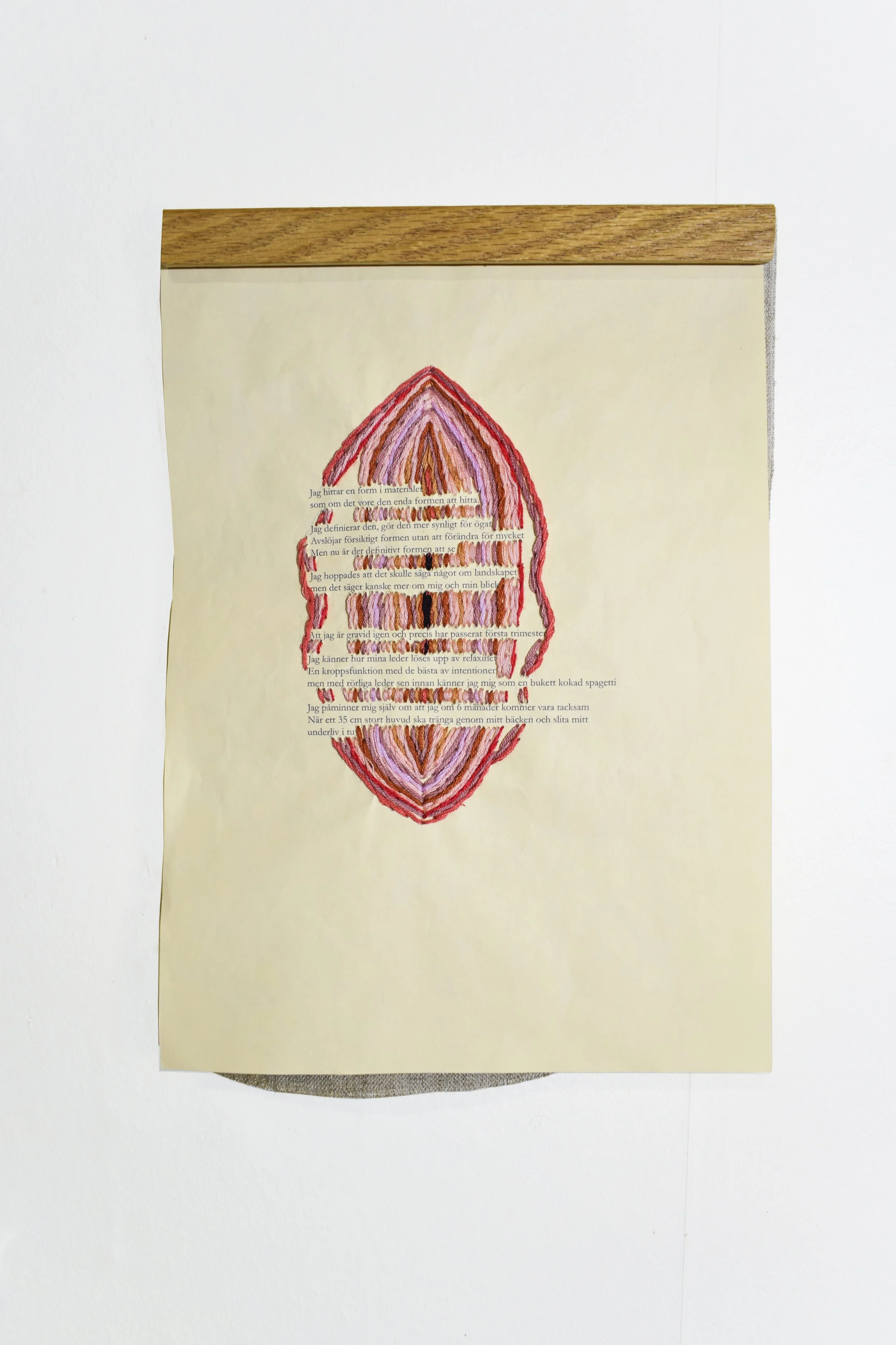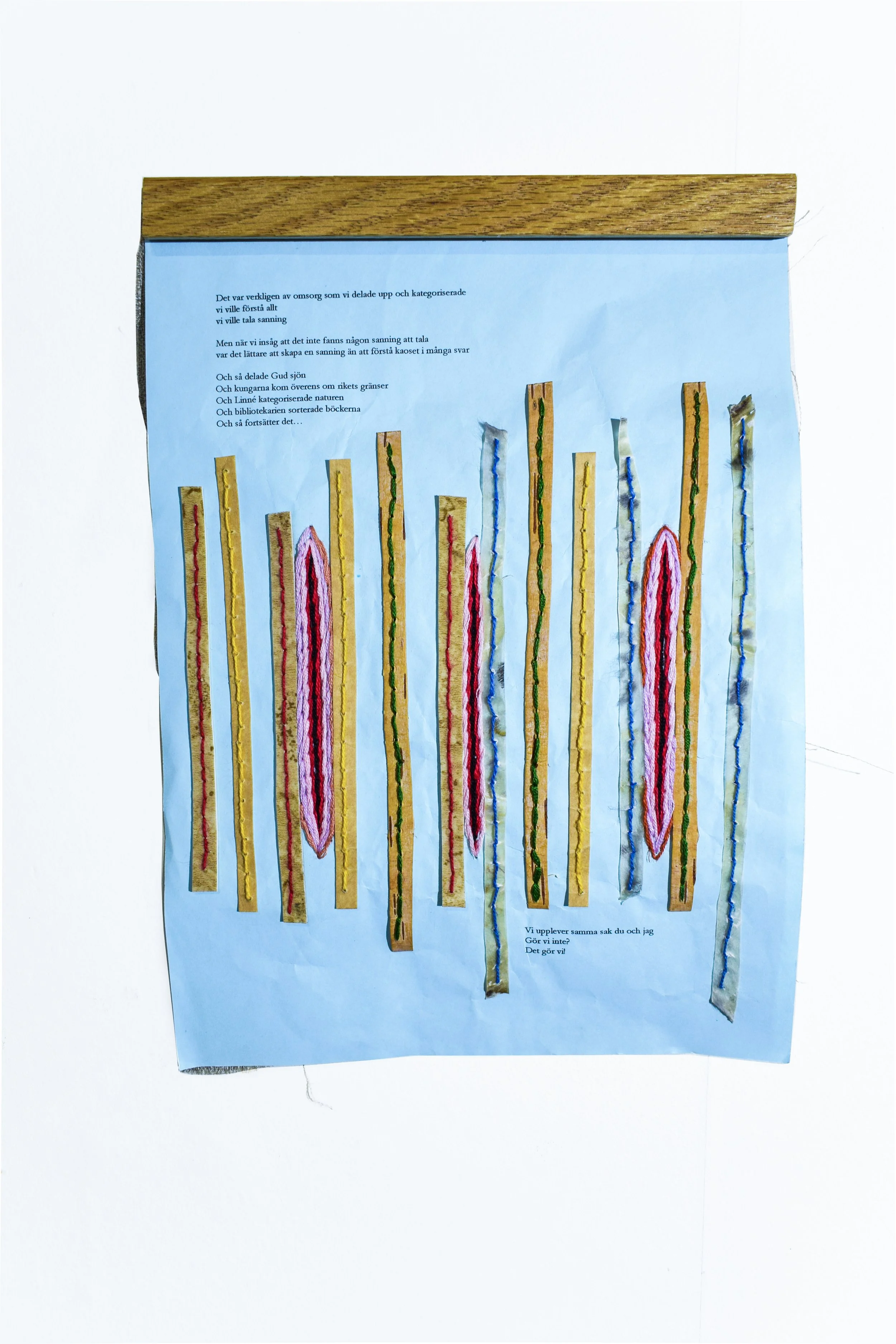 Text - Papper, Linoleum från ett badrumsgolv i Stavanger, Näver från en av björkarna som föll i höststormen 2018, Ull, Tråd