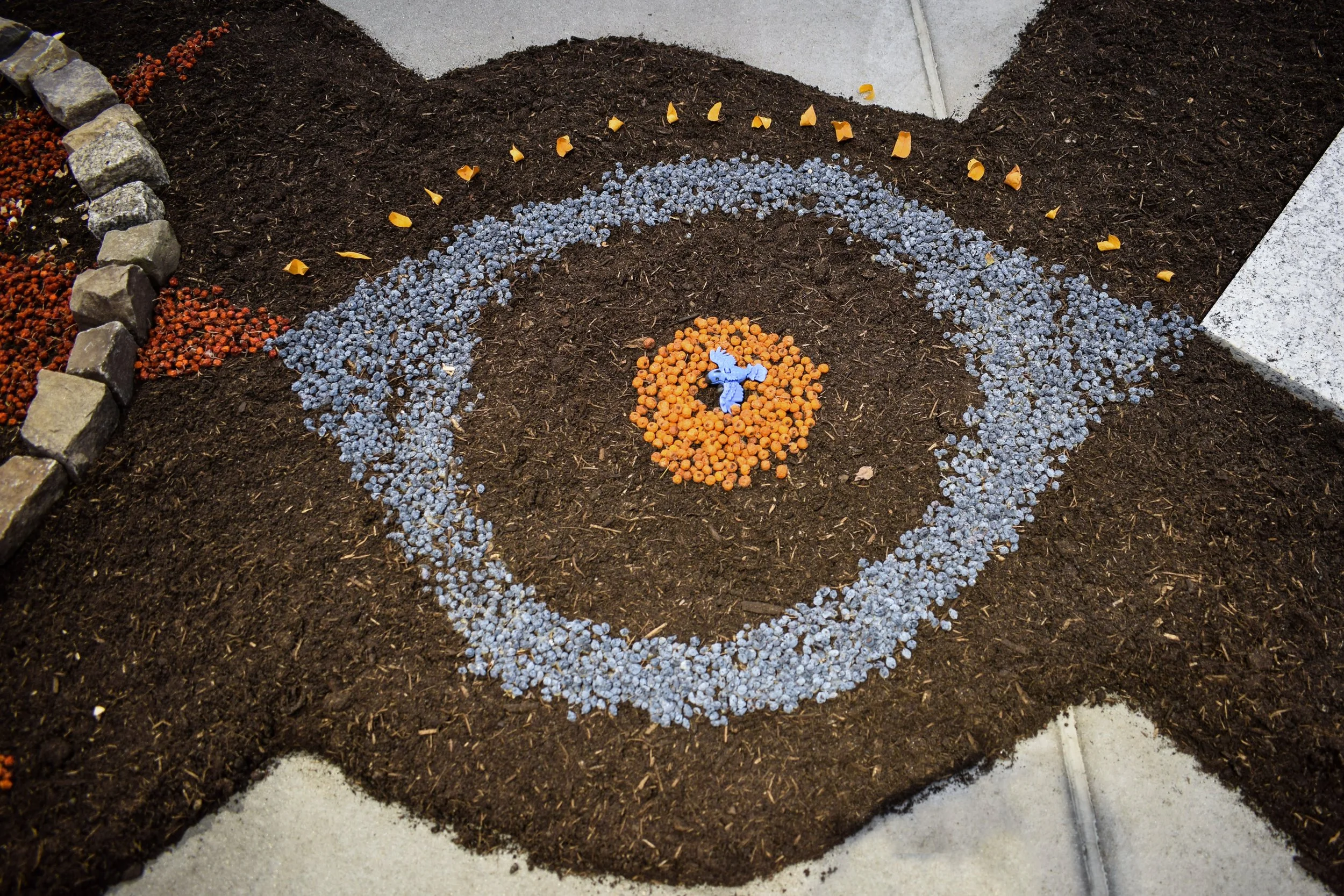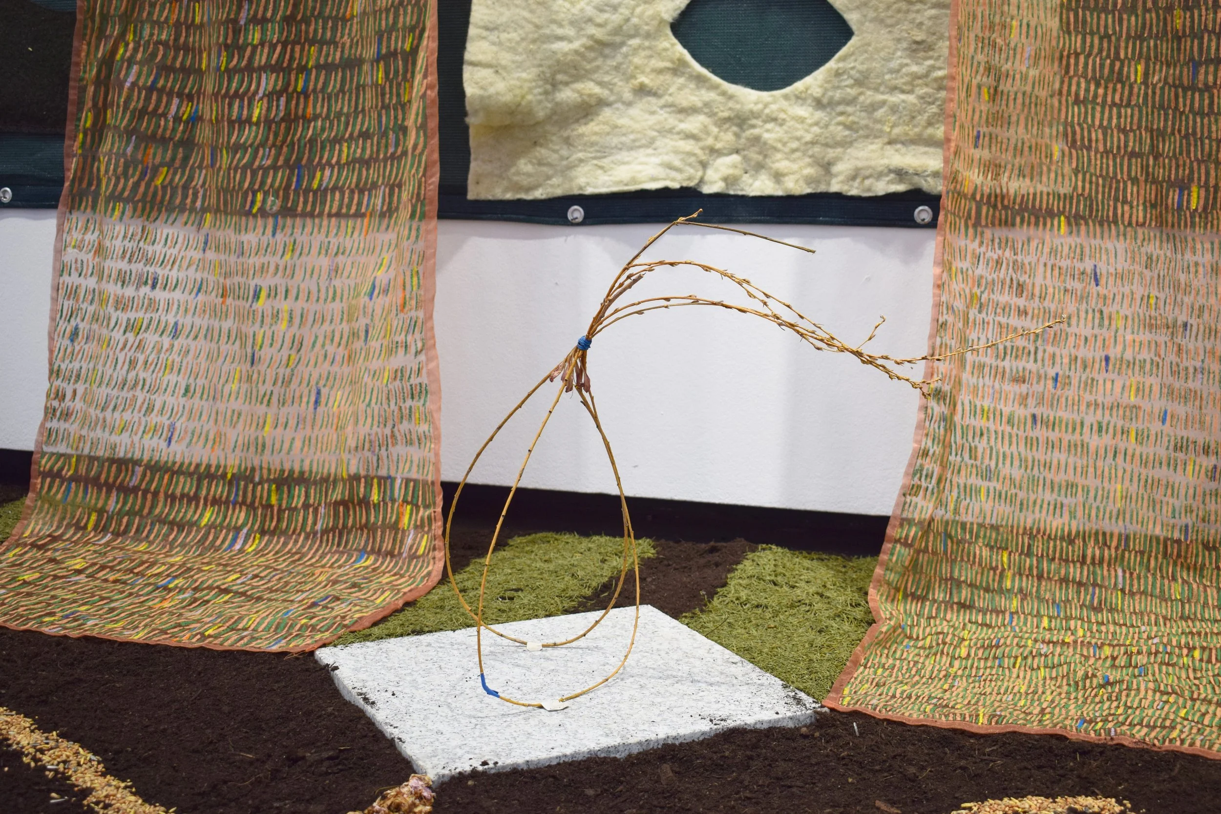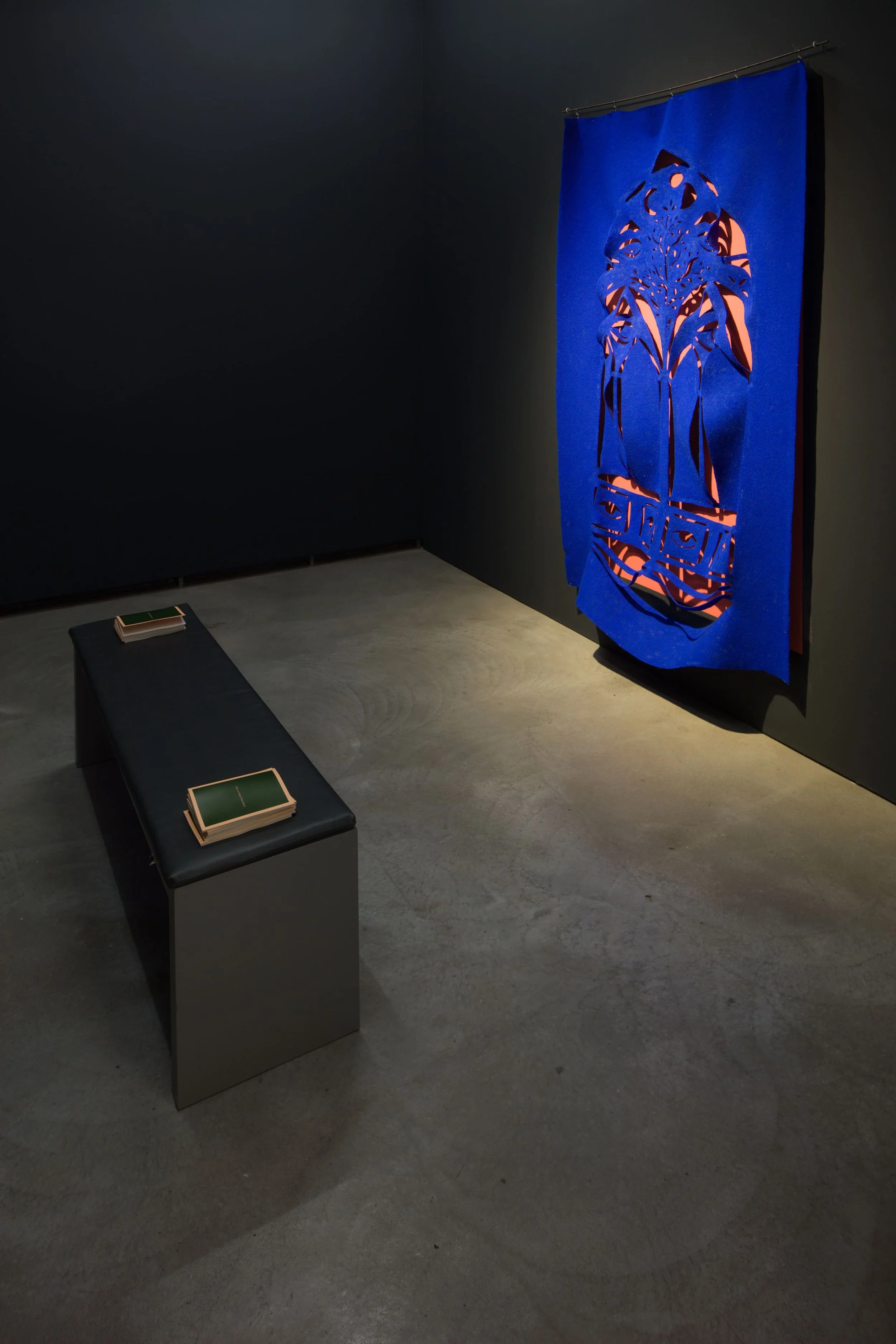 In the other room, a pamphlet was shown with texts and images that related to thoughts about a border, or the meeting between two contrasting values. On the wall hung a blue wool blanket with a cutout of a church window facing the other room. Blue is the rarest color to be found in nature. In tarot reading, the color blue represents the mental, the thoughts. The two rooms represented the division of the brain and the body as two starting points for thought.
