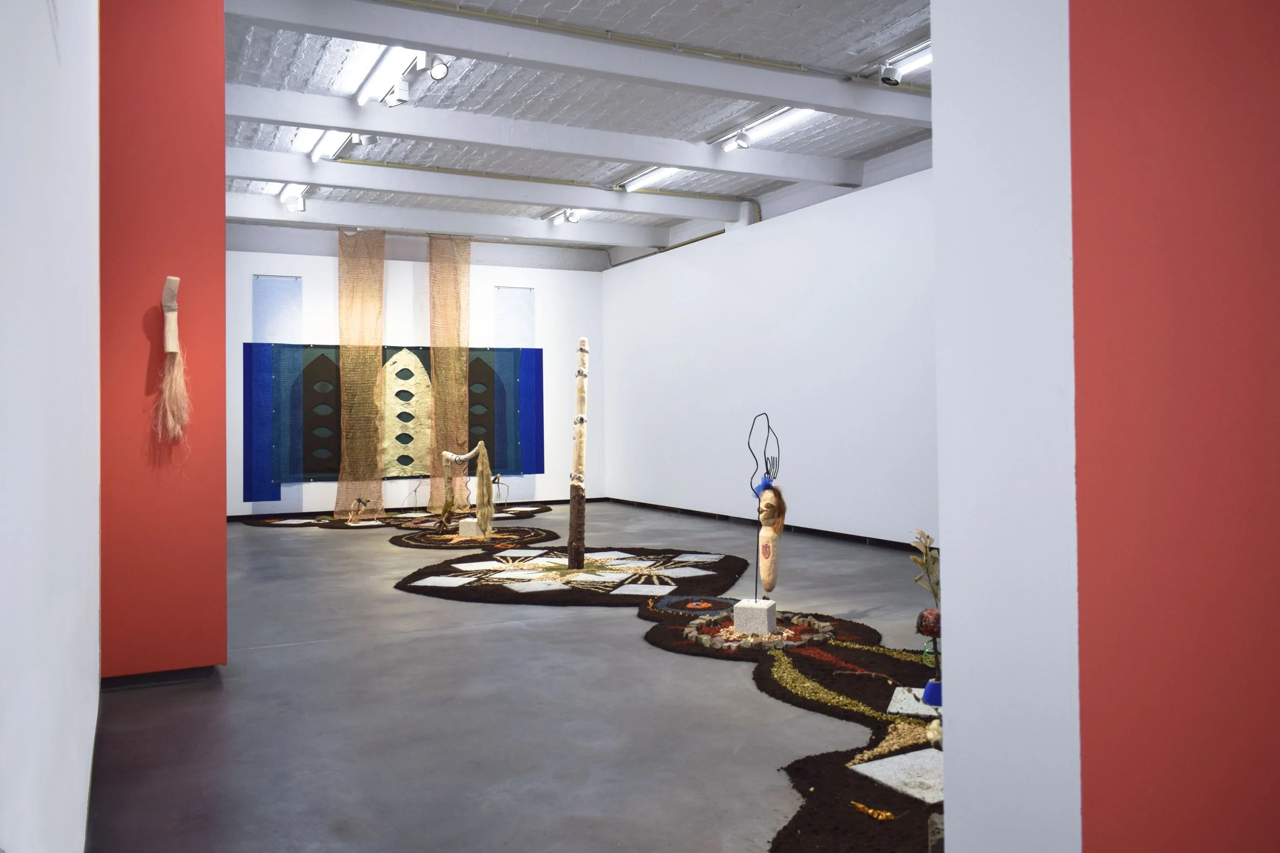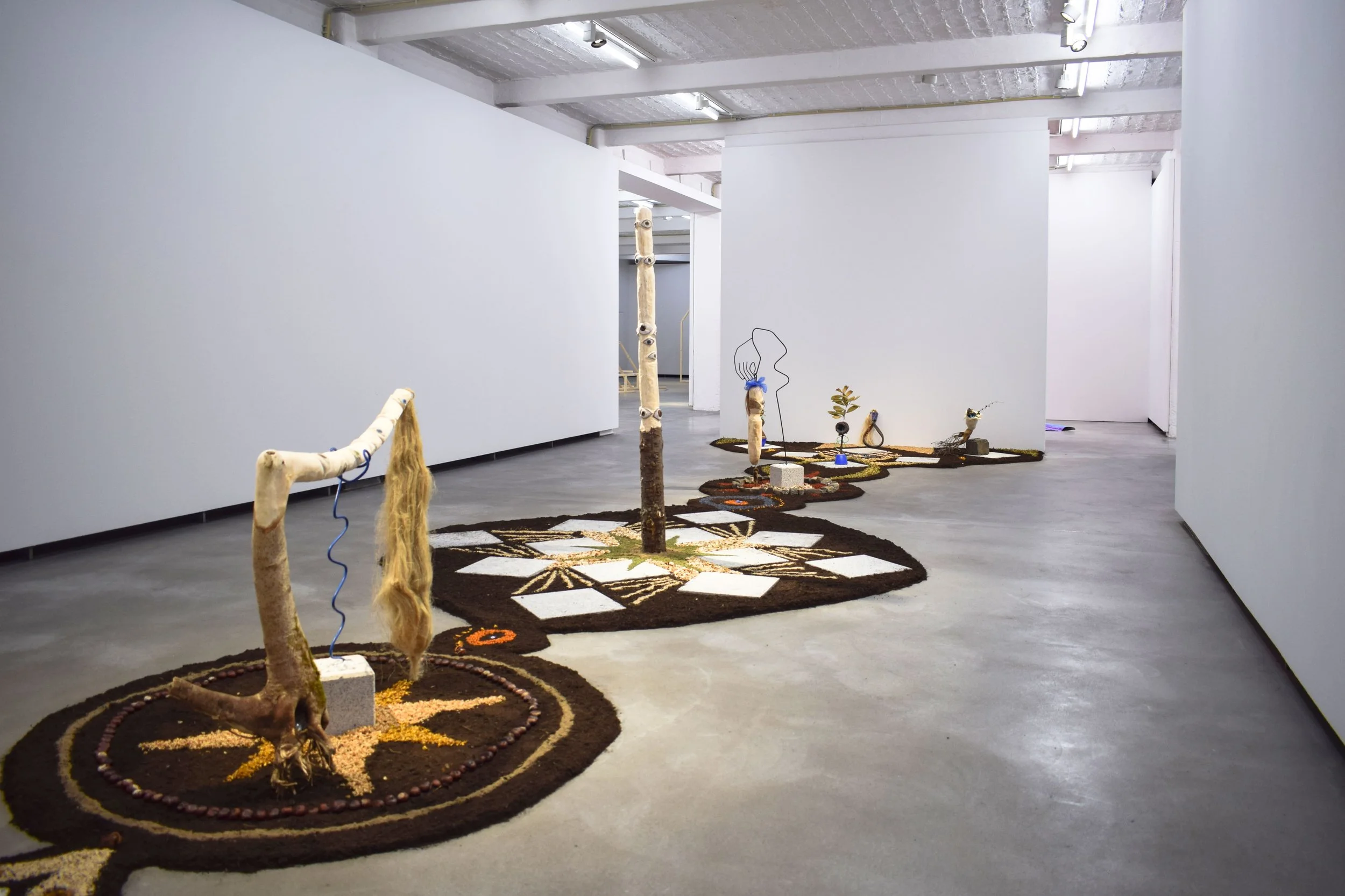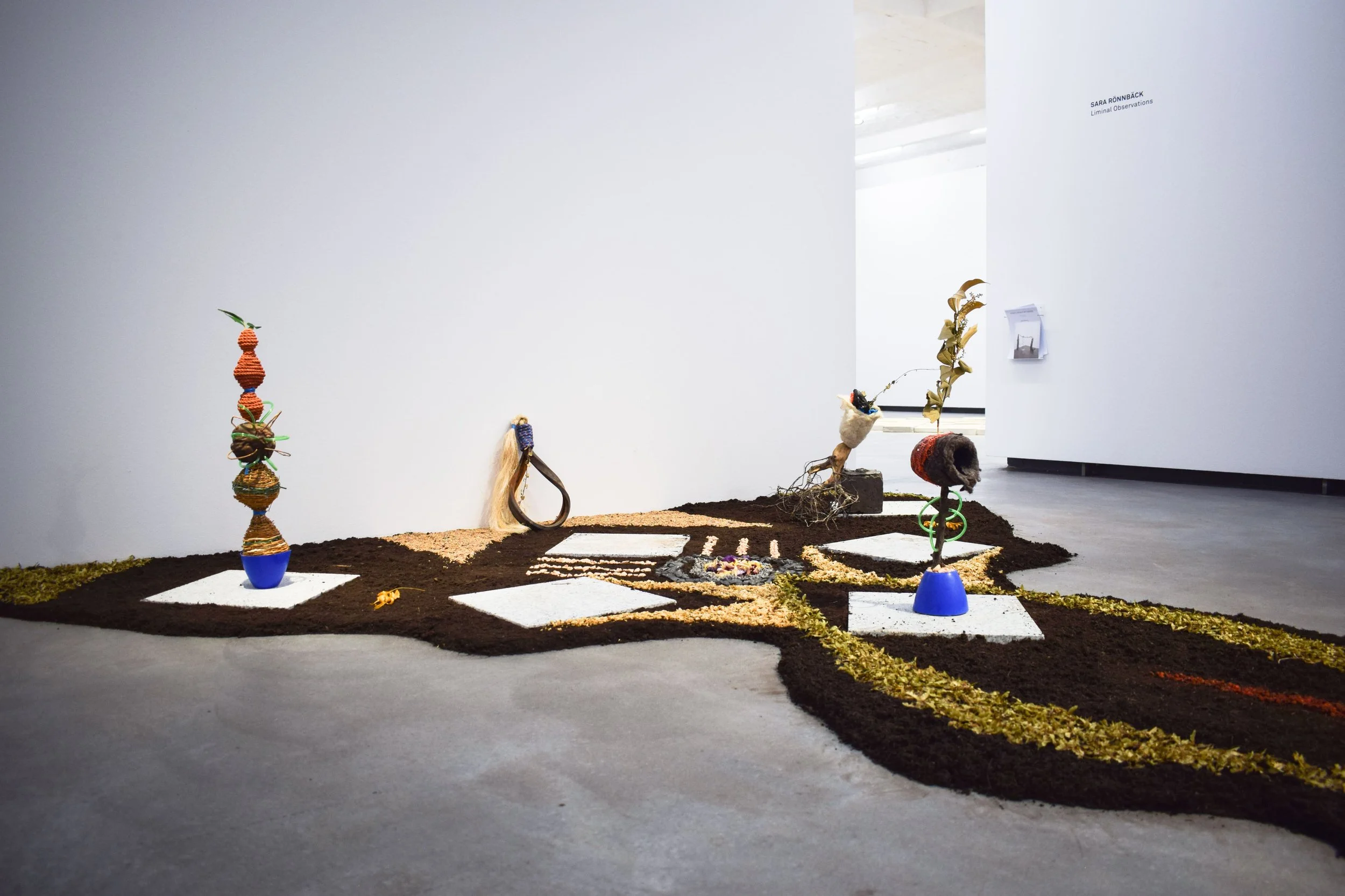 The work was shown in two rooms. One room had two entrances and showed an installation in the middle of the room which in that way formed a border with the two entrances. The border was made up of loose material, collected on the streets of Berlin and in the vicinity of our house in Västra Ämtervik. Out of the border rose sculptures made up of the same material exchange between the two conflicting places; the city and the country - culture and nature.