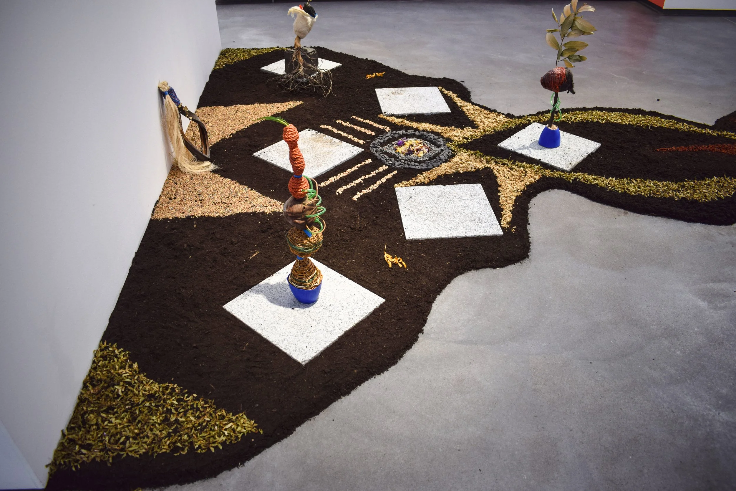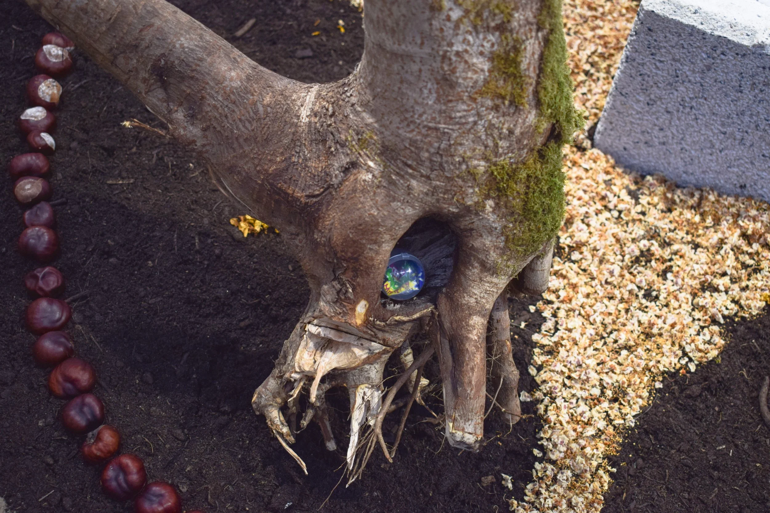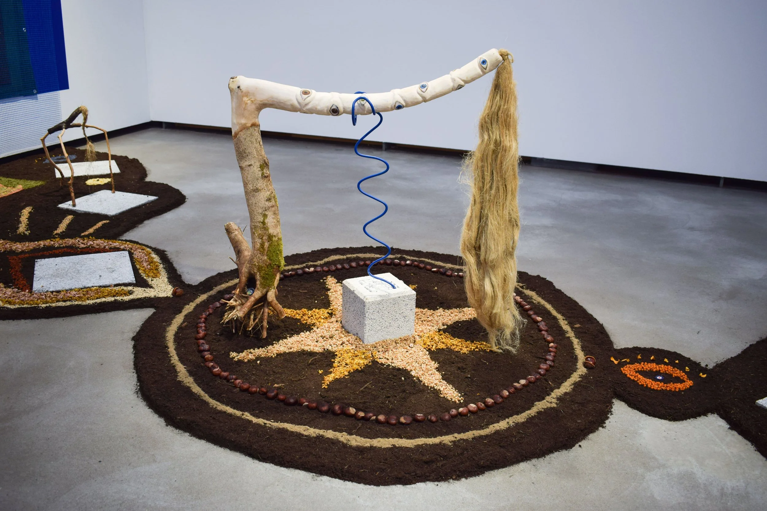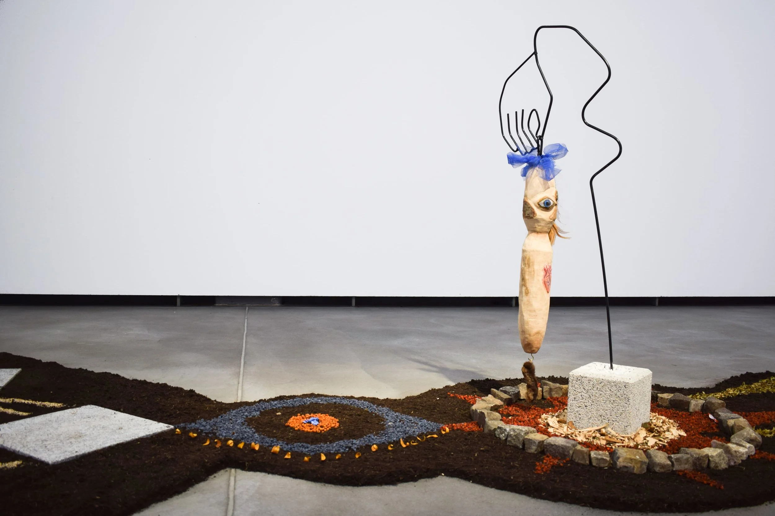 The work was shown in two rooms. One room had two entrances and showed an installation in the middle of the room which in that way formed a border with the two entrances. The border was made up of loose material, collected on the streets of Berlin and in the vicinity of our house in Västra Ämtervik. Out of the border rose sculptures made up of the same material exchange between the two conflicting places; the city and the country - culture and nature.
