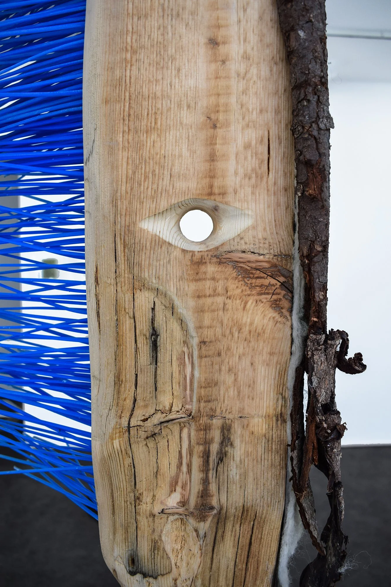 Stone from Hammarö, Wool from my neighbors sheep, bees wax from my neighbors bees, birch bark from the birch that fell in the autumn storm 2018, tinder fungus, abstract organ in wood fired ceramics, my hair, pvc pipe