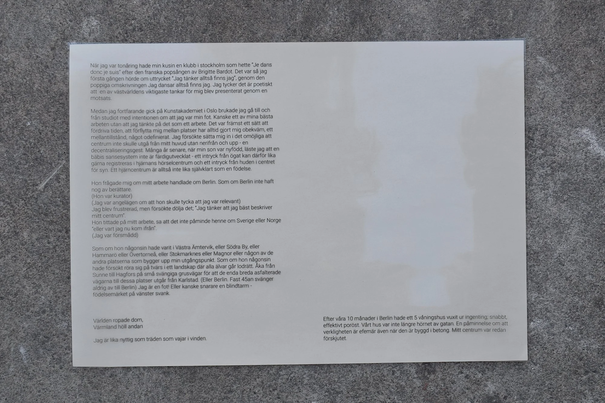 The work consists of nine sculptures and a text. As well as a choreography made in collaboration with and performed by the choreographer and dancer Karianne Karlsrud.
